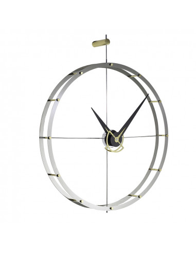 This clock is a unique piece with an innovative design that will fit in any modern environment with exquisite symmetry and especially highly valued for order lovers. The charm hidden in this wall clock may be due to its double ring design in polished brass and steel where twelve points are marked representing the hours of the day in golden.