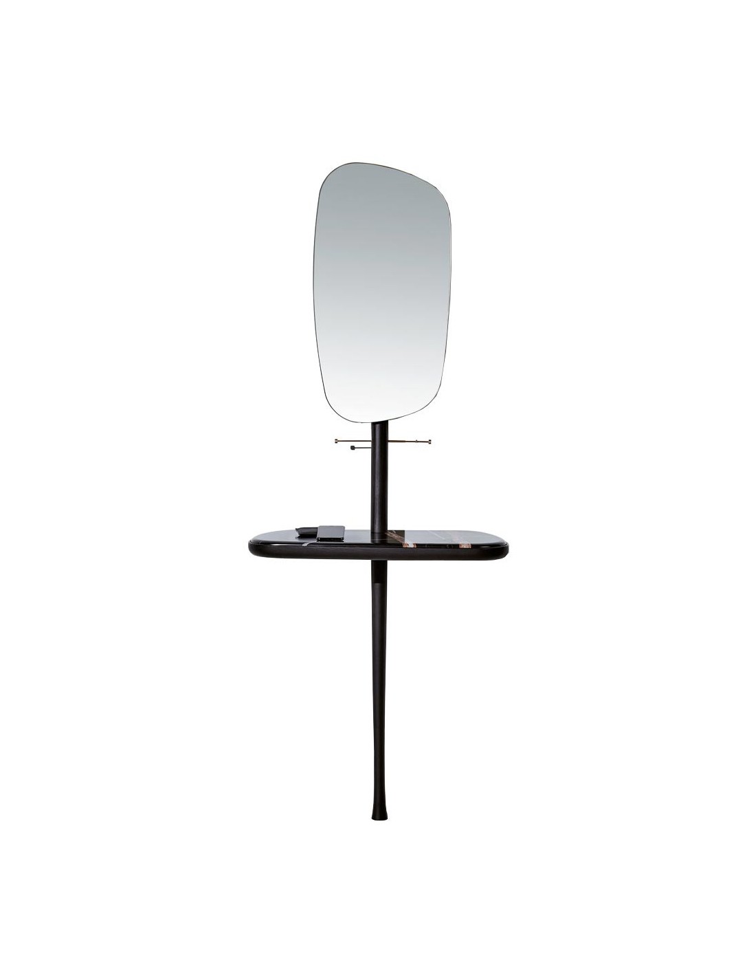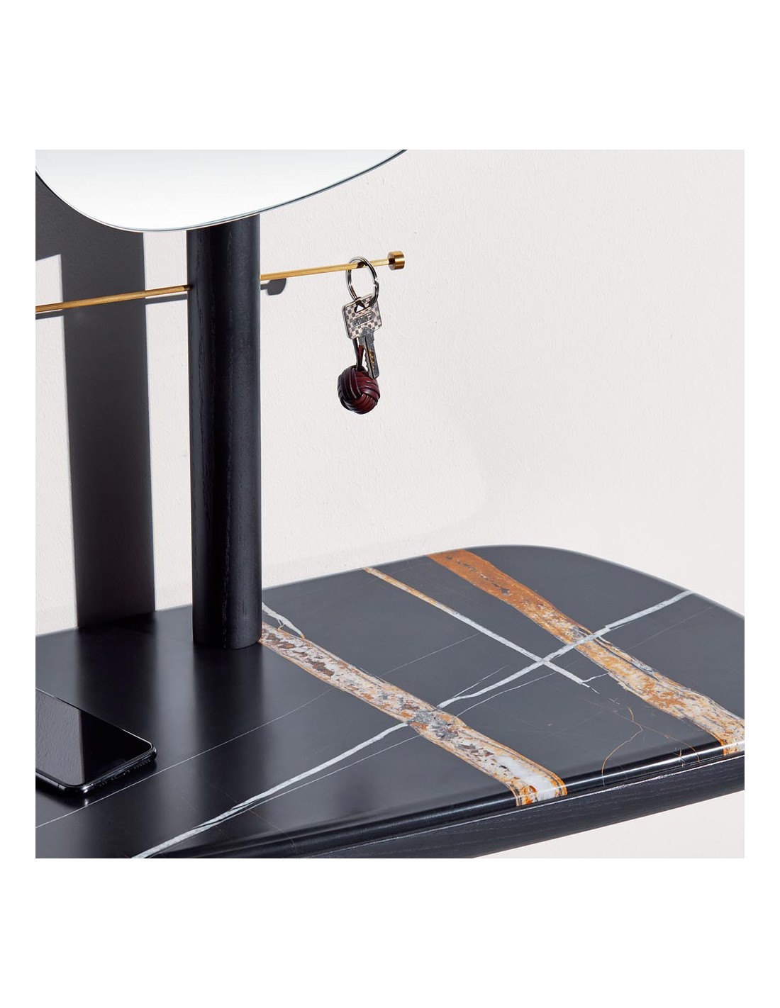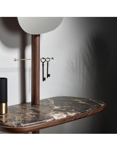 Modern furniture for hall or dressing room. Perfect for leaving your keys and accessories when you get home. This handcrafted piece of furniture is made of walnut or black-stained ash wood, with unique polished brass details, and can be customized with a Sahara Noir or Emperador marble top.