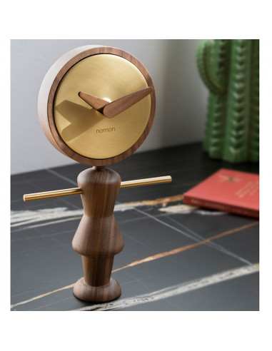Table clock designed by Nomon with body and hands in oak or walnut wood and polished brass or graphite lacquered.