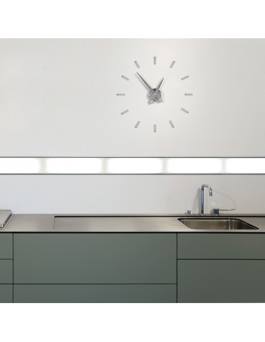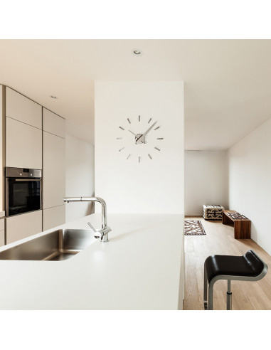 It works with batteries of 1,5 volts. It is manufactured by hand with an avant-garde design. It is a Nordic style adhesive clock ideal for houses with minimalist avant-garde design and especially the Nordic decorative elements predominate.