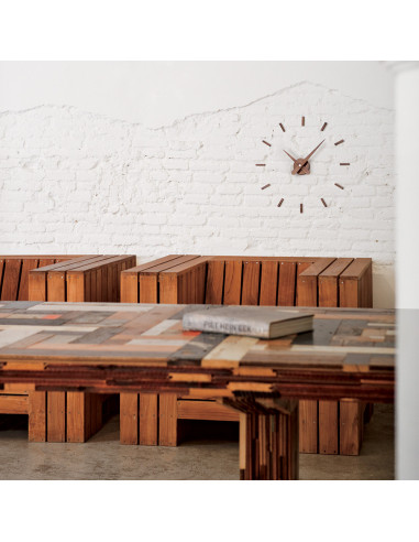 All the elements of the Nomon Sunset N Clock are made of walnut wood one of the finest and most delicate wood for its pleasant finish of a warm dark brown tones. As you can see in the photo for its dark tones thanks to the walnut wood it’s made of you can combine it with other wooden furniture of the same tone and it would make a nice design game. In addition, placing this wall clock on a surface with textures such as a brick wall or paint splatter will create a great contrast playing with colors and different textures.